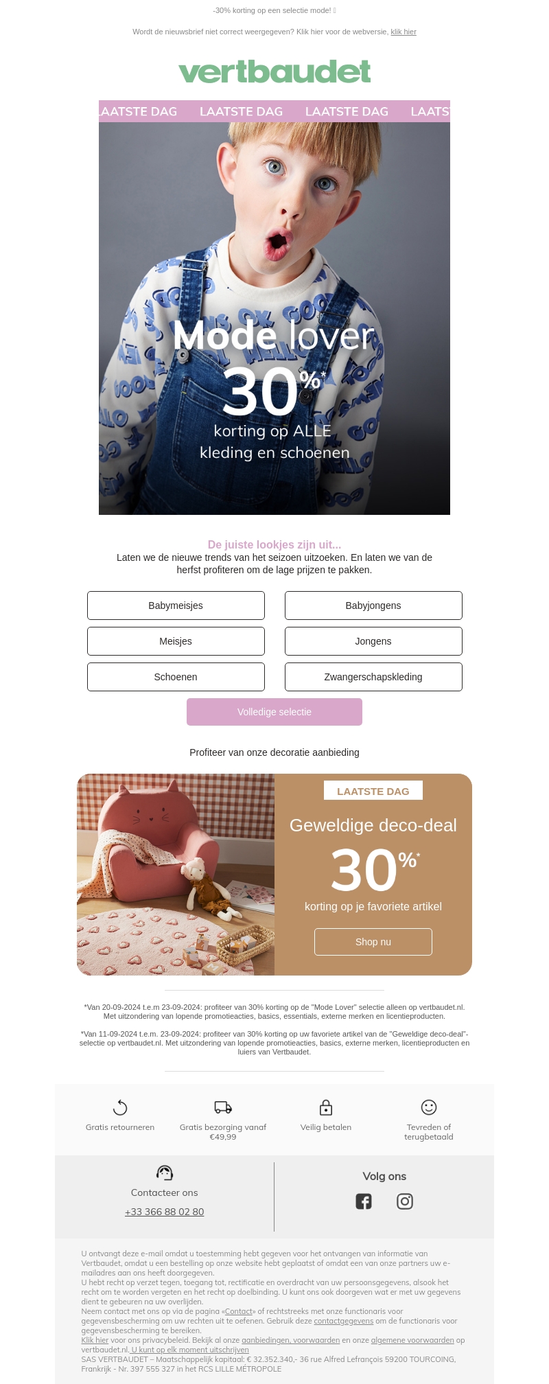 Dit is de laatste dag om te profiteren van geweldige aanbiedingen! Ontvang 30% korting op ALLE kleding en schoenen. Daarnaast hebben we een fantastische deco-deal met 30% korting op je favoriete artikel. Shop nu en pak je voordeel voordat de actie voorbij is.