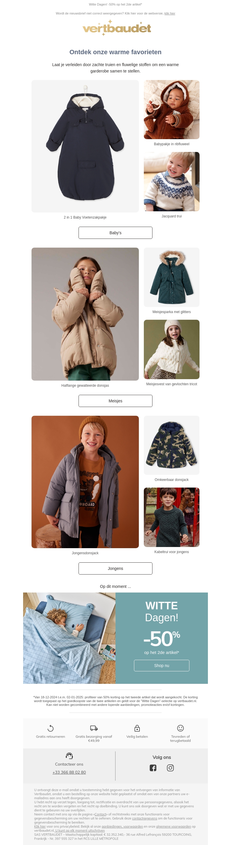 Laat je verleiden door zachte truien en warme stoffen om je garderobe compleet te maken. Met onze baby's, meisjes en jongenscollecties bieden we comfortabele en stijlvolle jassen en truien. Ontdek de laatste trends voor de winter met aantrekkelijke kortingen tijdens onze Witte Dagen actie. Profiteer van 50% korting op het tweede artikel. Shop nu voor een knusse winter!