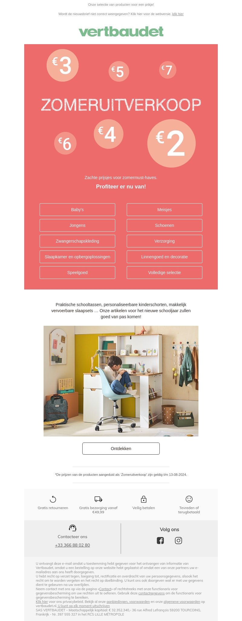 Vertbaudet's zomeruitverkoop is begonnen! Profiteer van kortingen op een brede selectie producten met prijzen vanaf slechts β¬2. Shop voor babyspullen, kinder- en zwangerschapskleding, schoenen, linnen en decoratie. Mis deze kans niet om jouw zomermust-haves te scoren tegen scherpe prijzen.