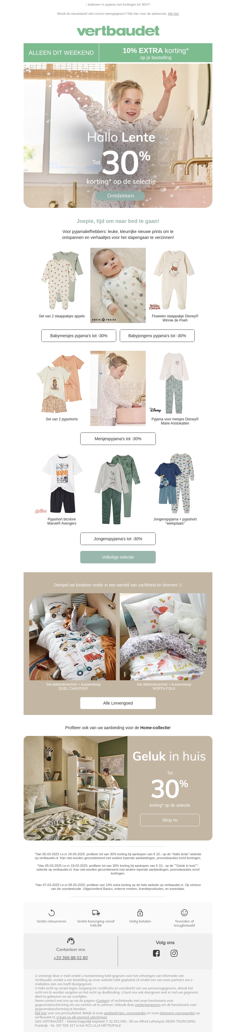 Gebruik dit weekend om te profiteren van 10% extra korting op geselecteerde items bij Vertbaudet. Ontdek de schattige pyjama's voor babymeisjes, babyjongens, meisjes en jongens. Daarnaast kunt u met zachte dekbedovertrekken uw kinderen laten dromen in stijl. Vergeet ook niet de aanbiedingen voor de home-collectie te bekijken.