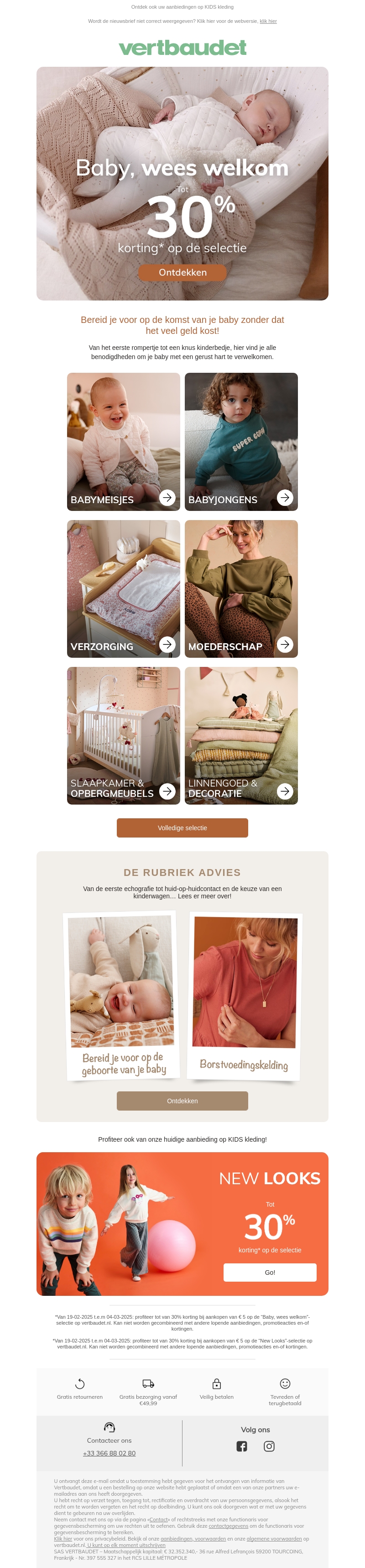 Vertbaudet verwelkomt nieuwe ouders met een spannende aanbieding. Ontdek tot 30% korting op een breed scala aan babyproducten. Bereid je voor op de komst van je kleintje met de beste producten. De collectie omvat alles van babykleding tot verzorging en meubels. Mis deze kans niet om te besparen op essentiΓ«le aankopen. Shop nu bij Vertbaudet en geniet van deze geweldige aanbieding.