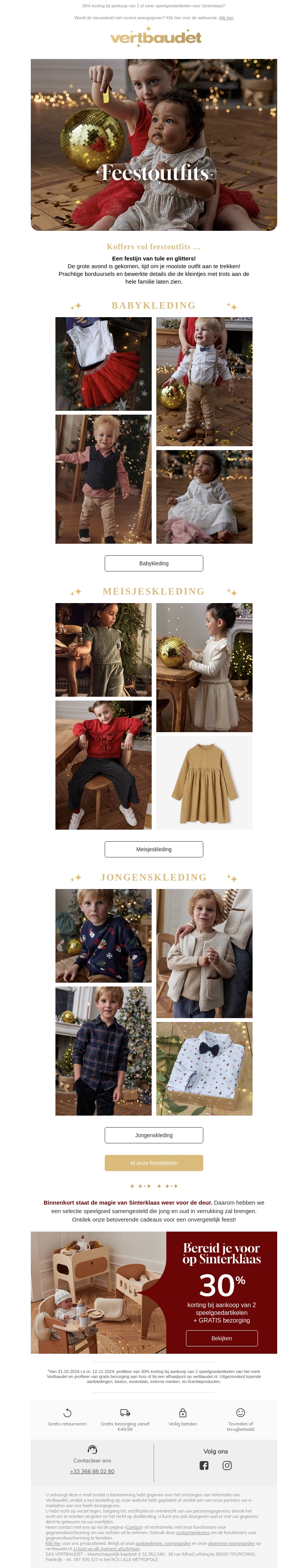 Verbaudet presenteert een sprankelende collectie voor de feestdagen. Ontdek feestelijke outfits voor baby's, jongens en meisjes, versierd met glitters en borduursels. Bereid je voor op Sinterklaas met geweldige cadeau-ideeën. Profiteer nu van 30% korting bij aankoop van 2 stuks speelgoed. Gratis levering is inbegrepen. Mis het niet!