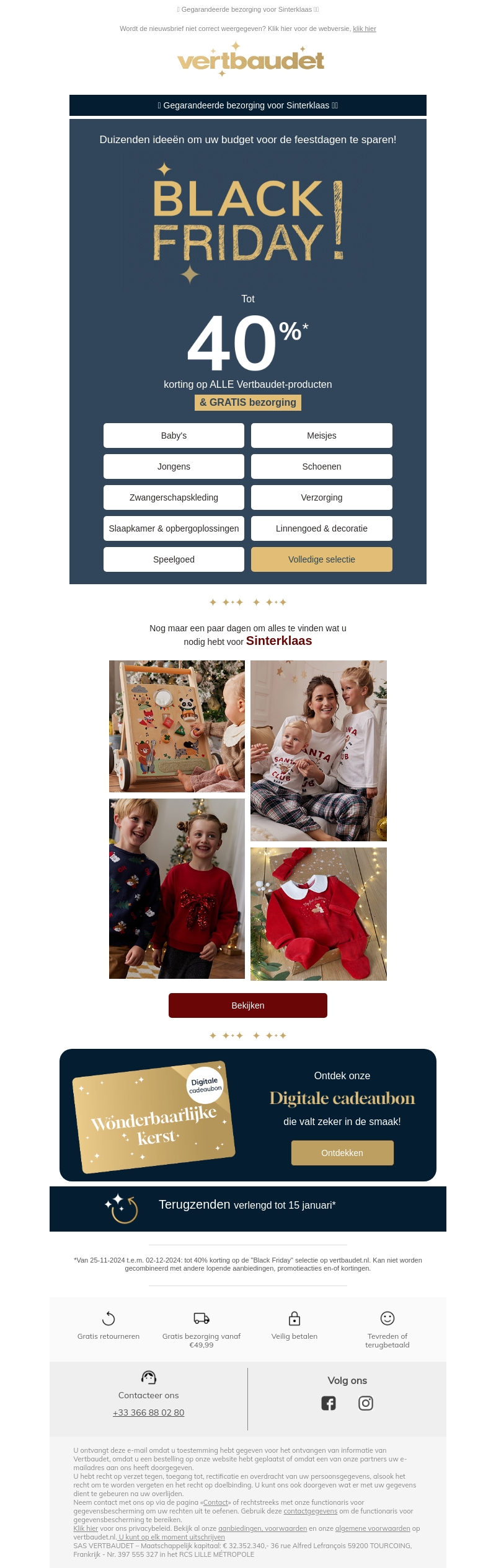 Verwen jezelf met de Black Friday aanbiedingen van Vertbaudet. Geniet van kortingen tot 40% op verschillende categorieën zoals babykleding, kinderschoenen en meer. Spaar nu voor de feestdagen en profiteer van gratis levering. Mis deze kans niet om unieke aanbiedingen te ontdekken!