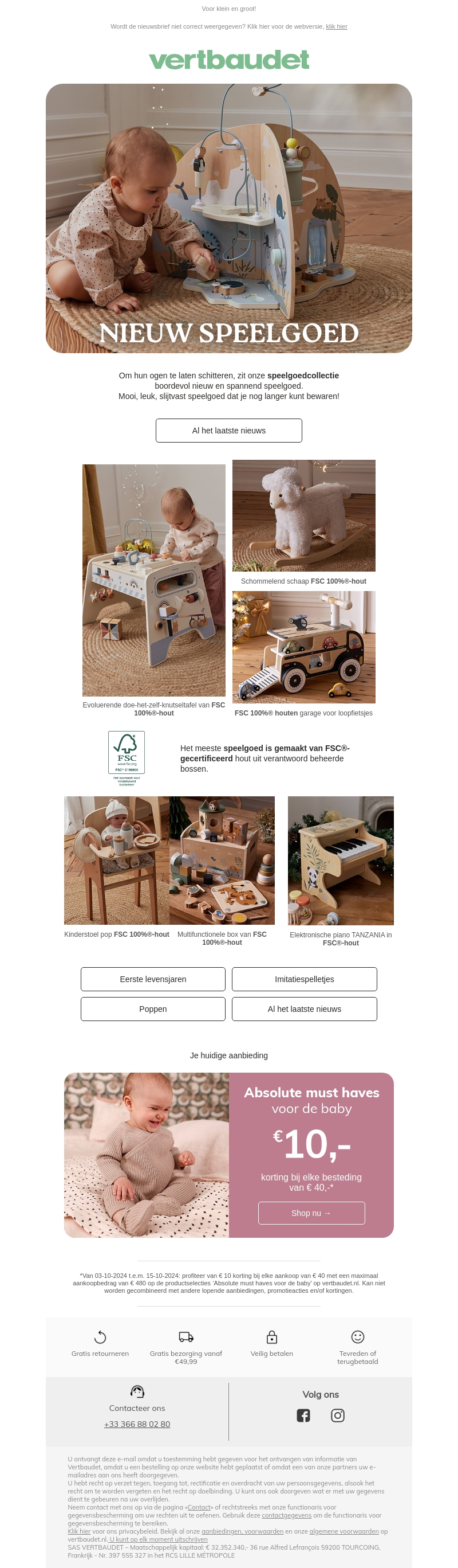 Ontdek de prachtige nieuwe speelgoedcollectie van Vertbaudet, perfect voor de allerkleinsten. Geniet van duurzaam en leuk speelgoed dat langer meegaat. Ontvang een speciale korting van €10 bij een bestelling van €40. Bezoek onze website om de hele collectie te bekijken. Profiteer van gratis bezorging vanaf €49,99. Veilig genieten van hoogwaardige producten.