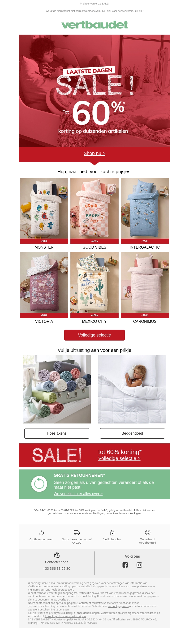 Vertbaudet biedt een spectaculaire sale met tot 60% korting op een breed assortiment beddengoed. Van kleurrijke dekbedovertrekken tot zachte hoeslakens, er is voor ieder wat wils. Mis deze kans niet om uw slaapkamer op te frissen met stijlvolle aanbiedingen. Gratis retourneren, dus geen zorgen als iets niet past. Shop nu en geniet van de beste deals!