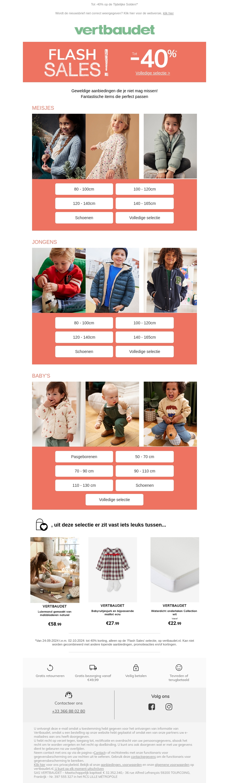 Ontdek geweldige aanbiedingen bij Vertbaudet! Van kleding voor meisjes, jongens en baby's tot schoenen en accessoires. Profiteer van kortingen tot 40%! Shop nu de volledige selectie.