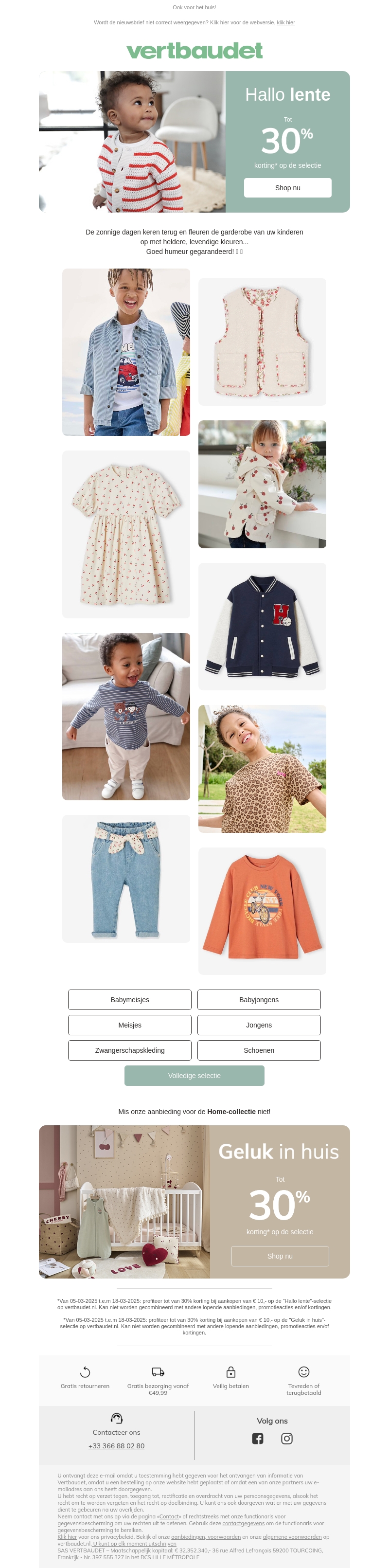 Vier de komst van de lente met een speciale aanbieding. Geniet van tot wel 30% korting op een selectie voorjaarskleding voor kinderen. Frisse kleuren en vrolijke patronen brengen de garderobe van je kind tot leven. Of je nu op zoek bent naar iets voor meisjes of jongens, er is voor ieder wat wils. Mis deze kans niet om de kleintjes in het nieuw te steken. Ontdek de selectie en bespaar nu!