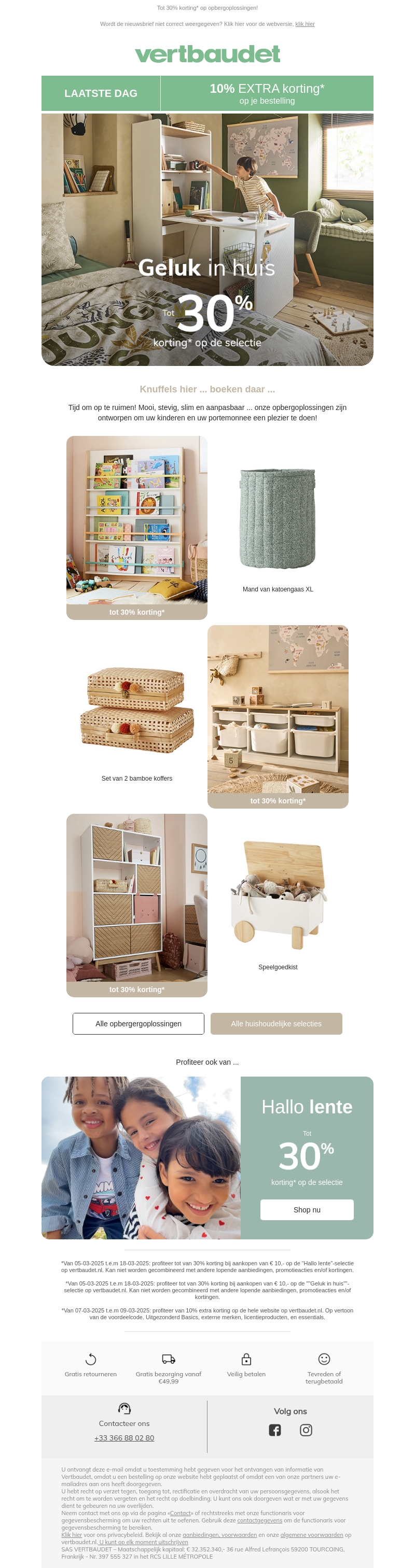 Mis de kans niet om 10% extra korting te krijgen op alle producten bij Vertbaudet. Dit is de laatste dag van deze geweldige aanbieding. Of u nu voor de kinderen winkelt of het huis inricht, dit is het moment om te besparen. Ontdek de slimme en aanpasbare opbergoplossingen, en bekijk de voorjaarsselecties met tot wel 30% korting. Handel snel en shop nu voordat de actie eindigt!