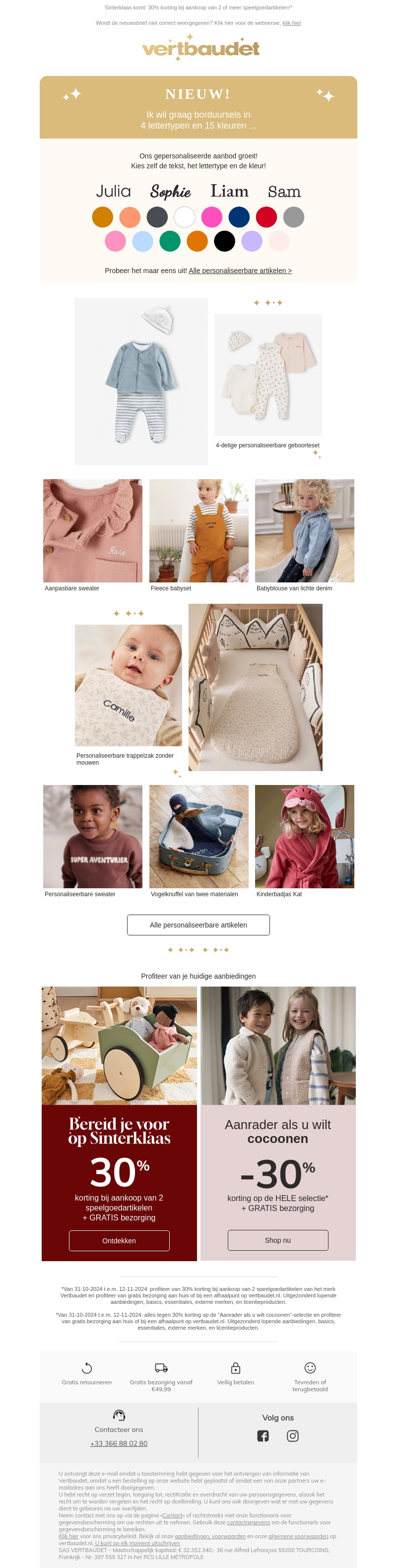 Vertbaudet introduceert een uniek concept waarbij u zelf uw borduursels kunt kiezen uit 4 lettertypen en 15 kleuren. Personaliseer diverse artikelen zoals babykleding en accessoires. Profiteer van een speciale aanbieding voor Sinterklaas met 30% korting bij aankoop van twee speelgoedartikelen. Ervaar de vrijheid van creativiteit en maak elk item uniek.