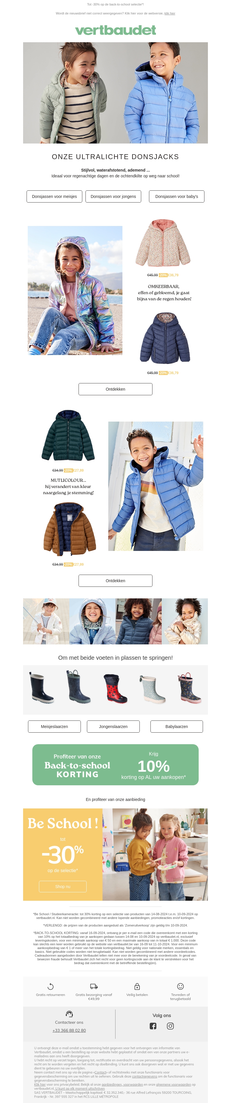 Maak kennis met onze nieuwste ultralichte donsjacks! Deze stijlvolle en ademende jassen zijn ideaal voor regenachtige dagen en om in de herfst naar school te gaan. Beschikbaar voor jongens, meisjes en baby's, onze donsjacks bieden comfort en bescherming tegen de elementen. Ontdek de verschillende kleuren en stijlen vandaag nog en profiteer van onze speciale Back-to-School korting!