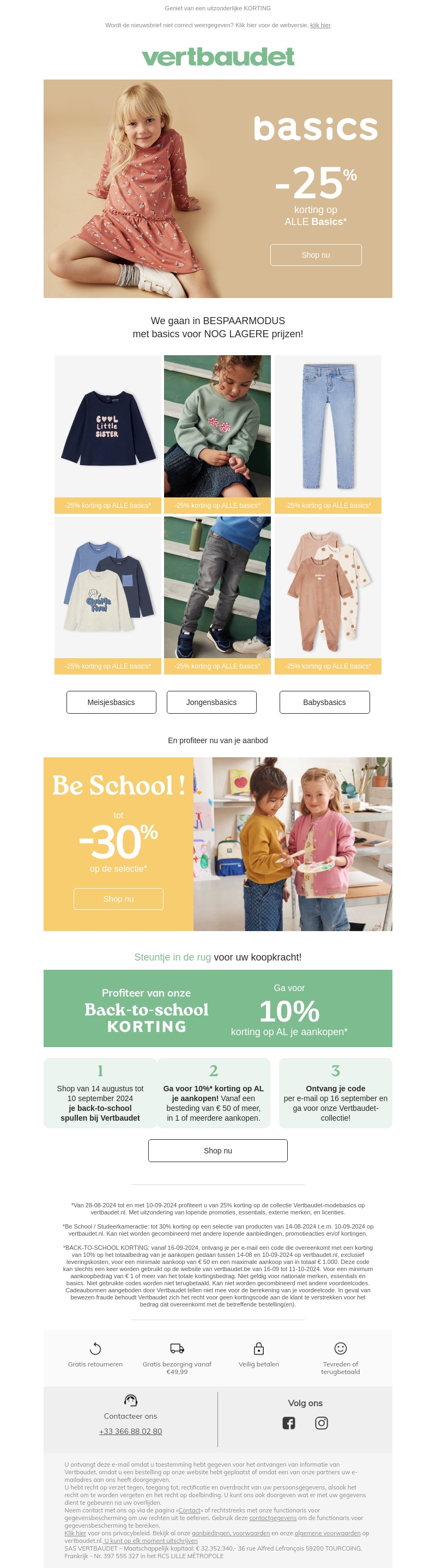 Ontvang 25% korting op alle basisproducten bij Vertbaudet! Van meisjes- en jongenskleding tot schattige babyoutfits, bespaar op de essentials. Shop snel en geniet van deze exclusieve aanbieding.