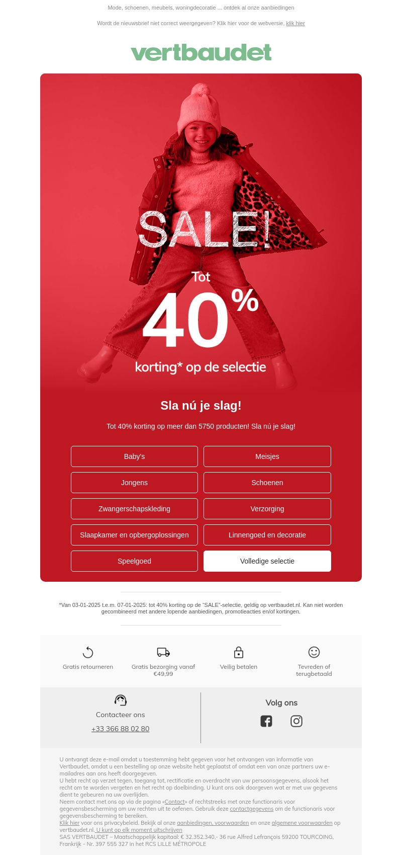 Mis deze kans niet om te besparen op meer dan 5750 producten bij Vertbaudet! Of je nu op zoek bent naar kleding voor baby's, kinderen of zwangerschapskleding, er is voor ieder wat wils. Ook slaapkameroplossingen en linnengoed zijn nu flink afgeprijsd. Wacht niet langer en sla nu je slag met kortingen tot wel 40%! Bezoek onze website en ontdek de volledige selectie. Veel shopplezier gegarandeerd!