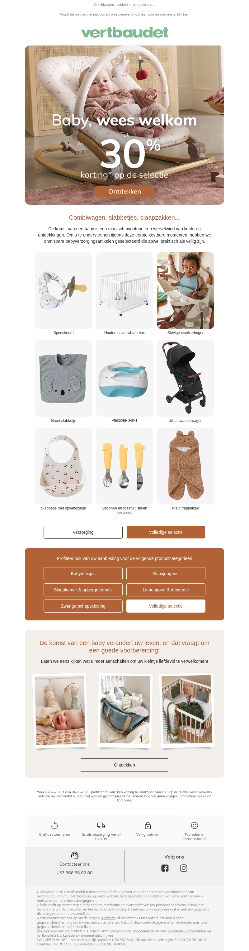 Welkom baby! Profiteer van tot 30% korting op een selectie van essentiΓ«le babyartikelen. Ontdek ons assortiment van combiwagens, slabbetjes en slaapzakken. We hebben voor u een praktische en veilige keuze samengesteld om het leven met uw kleintje gemakkelijker te maken. Maak gebruik van de korting en bekijk onze volledige selectie.