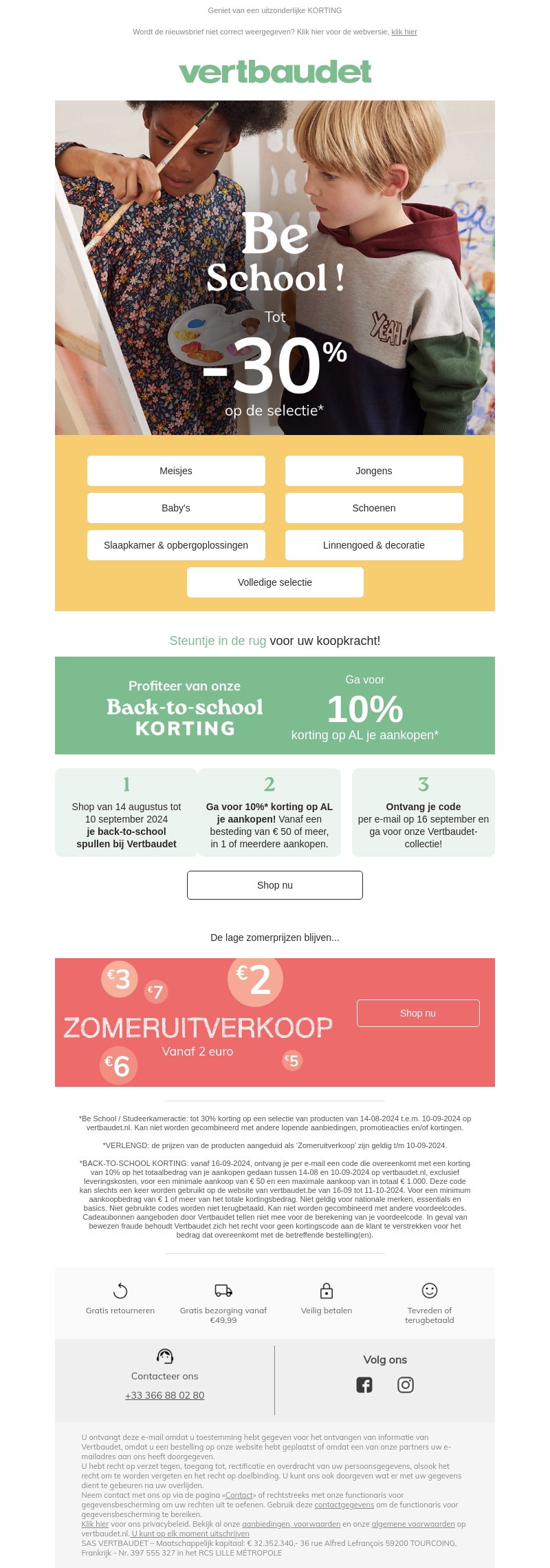 Vertbaudet biedt nu tot 30% korting op hun back-to-school selectie. Of je nu op zoek bent naar kleding voor meisjes, jongens of baby's, of naar schoenen en slaapkameroplossingen, je vindt het hier. Mis het niet en shop voor 10 september 2024 om van deze aanbiedingen te profiteren. Daarnaast verlengt Vertbaudet de zomeruitverkoop met prijzen vanaf 2 euro!