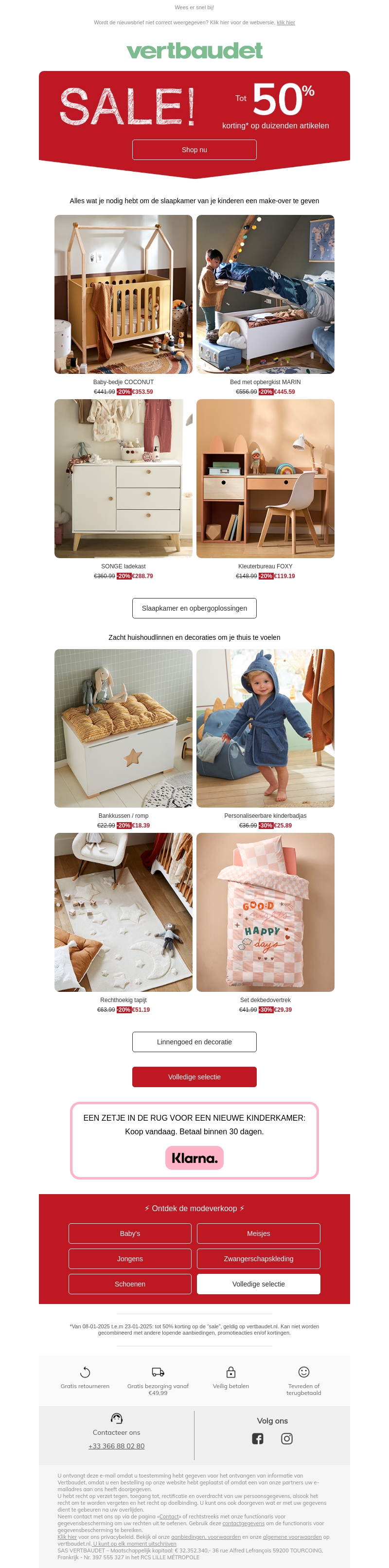 Profiteer van gigantische kortingen tot wel 50% op kinderkamers bij Vertbaudet. Van bedden tot bureaus en decoratieve accessoires, alles wat je nodig hebt voor een perfecte make-over van de kinderkamer. Grijp je kans om stijlvolle en functionele meubels aan te schaffen voor minder. Beperkt beschikbare artikelen, dus wees er snel bij. Bekijk nu onze volledige selectie aan producten. Shop veilig en eenvoudig online.