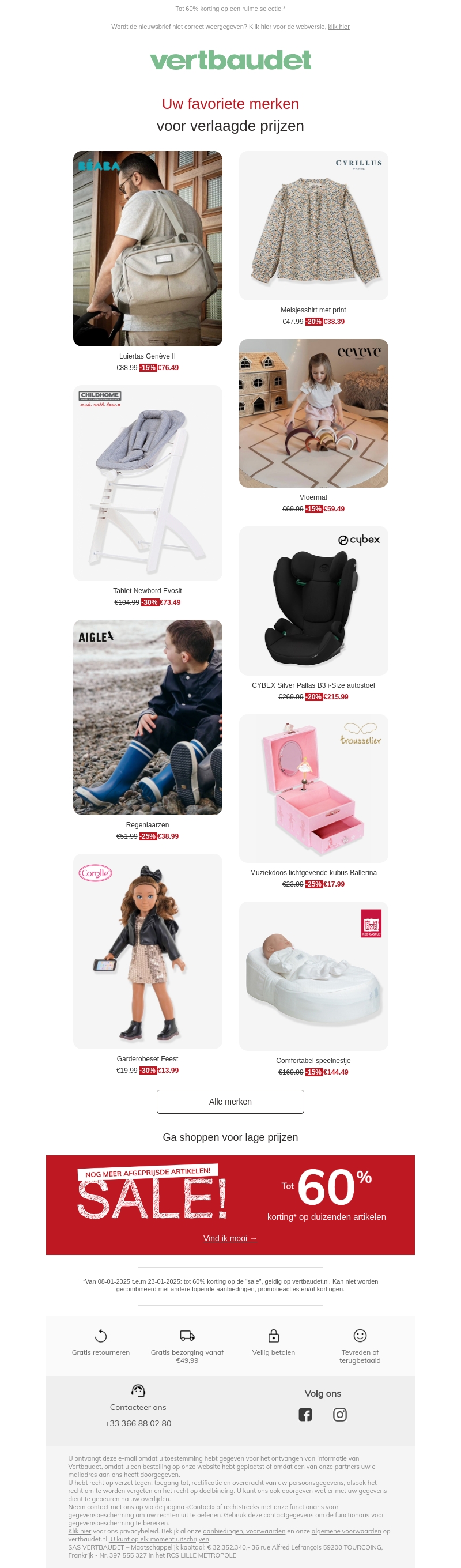 Pak nu uw kans om geweldige kortingen tot 60% te scoren op een breed scala aan producten van topmerken. Of u nu op zoek bent naar stijlvolle kleding, praktische babyspullen of creatief speelgoed, er is voor ieder wat wils. Wees snel, want deze aanbiedingen gelden slechts tijdelijk. Vergeet niet uw favorieten te bekijken en geniet van veilig winkelen met gratis retour. Mis het niet!