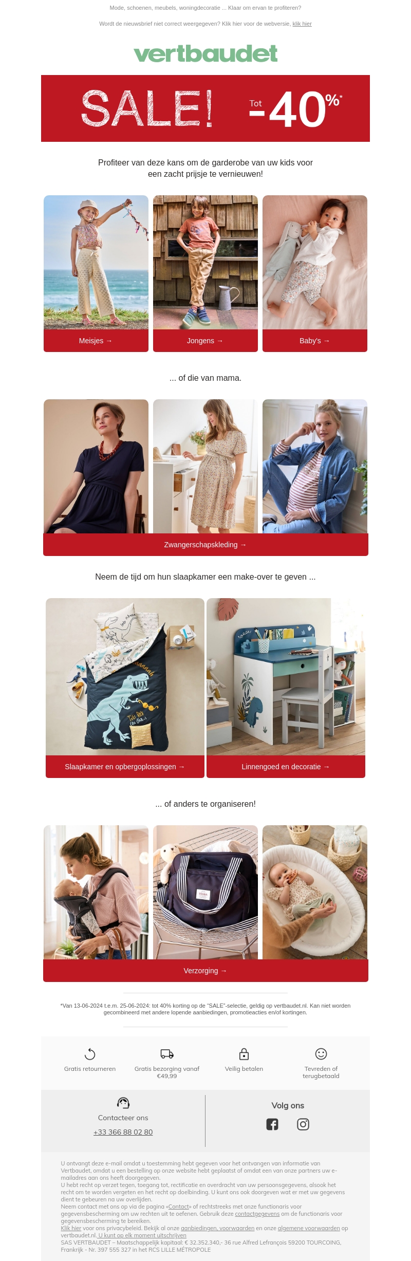 Bij Vertbaudet zijn de prijzen flink gedaald. Ontdek de sale met kortingen tot 40% op allerlei artikelen voor kinderen en aanstaande moeders. Verwen je kinderen met nieuwe kleding of geef hun slaap- en speelkamers een makeover. Wees er snel bij voordat de aanbiedingen weg zijn!