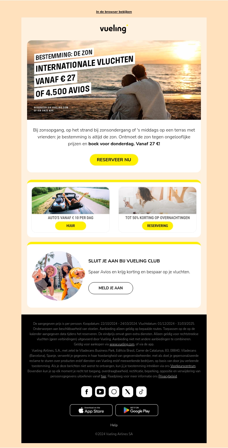 Bij Vueling boek je nu internationale vluchten naar zonnige bestemmingen al vanaf €27 of 4.500 Avios. Geniet van de zonsondergang op het strand of een gezellig terras. Reserveer snel om te profiteren van deze ongelooflijke prijzen. Sluit je aan bij de Vueling Club en spaar Avios voor extra kortingen. Ontdek ook autoverhuur vanaf €10 per dag en tot 50% korting op overnachtingen.