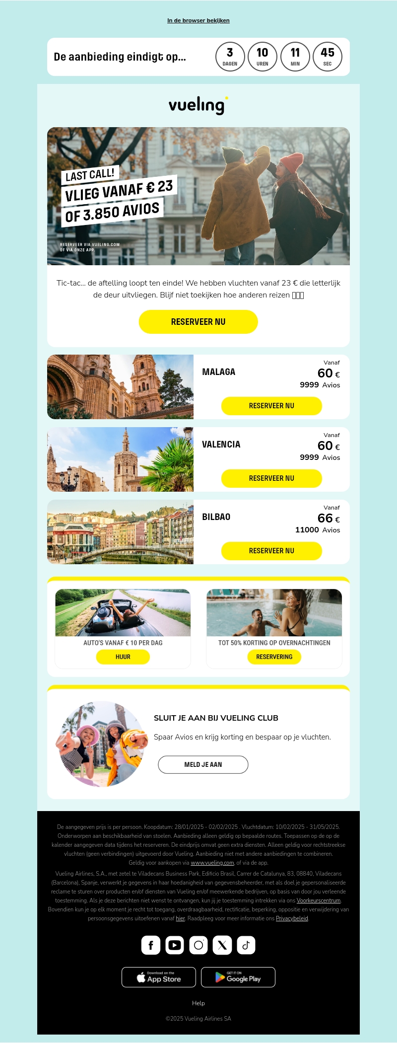 De tijd dringt! Boek nu vluchten vanaf slechts €23 of 3.850 Avios. Kies uit populaire bestemmingen zoals Malaga, Valencia, en Bilbao. Profiteer van autoverhuur vanaf €10 per dag en 50% korting op overnachtingen. Sluit je aan bij de Vueling Club voor extra voordelen.