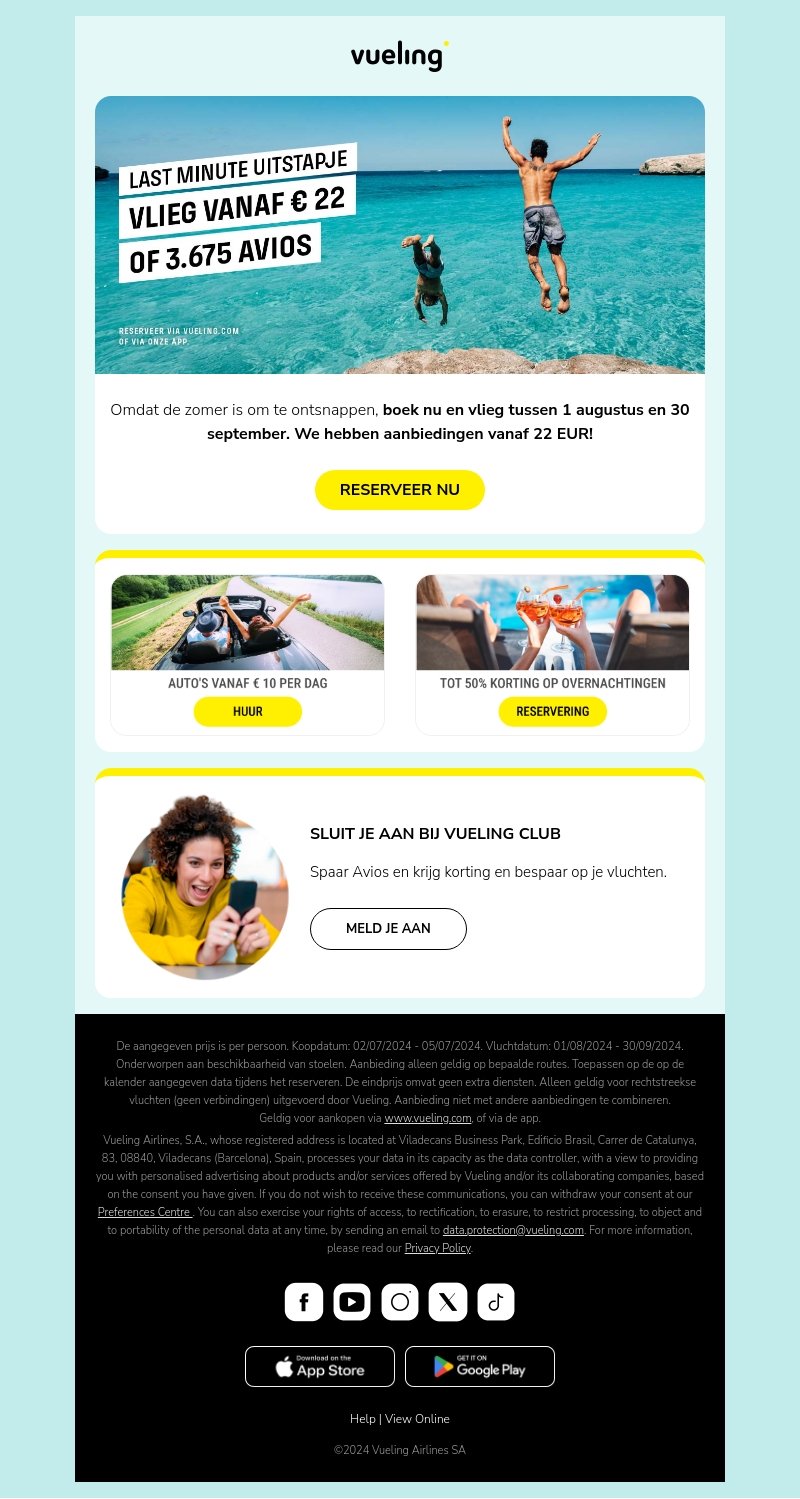De zomer is de perfecte tijd om te ontsnappen! Boek nu en vlieg tussen 1 augustus en 30 september vanaf slechts β¬22 of 3.675 Avios. Reserveer via Vueling en geniet van geweldige deals, inclusief autos vanaf β¬10 per dag en tot 50% korting op overnachtingen.