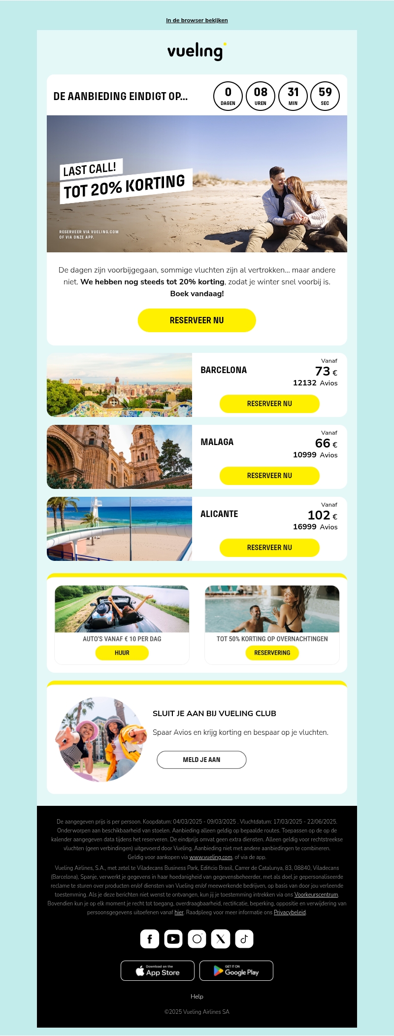 Mis deze kans niet om tot 20% korting te ontvangen op geselecteerde vluchten. Met bestemmingen zoals Barcelona, Malaga en Alicante is er voor ieder wat wils. Reserveer nu om deze geweldige aanbiedingen te benutten. Auto's kunnen worden gehuurd vanaf slechts €10 per dag. Bovendien krijg je tot 50% korting op overnachtingen. Vergeet niet om je aan te sluiten bij de Vueling Club voor extra voordelen!