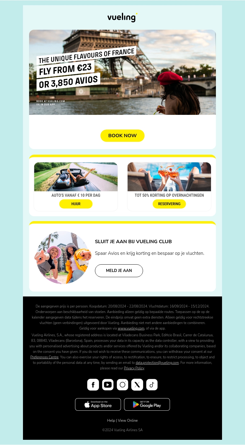 Franse avonturen wachten op je! Vlieg naar Frankrijk vanaf slechts β¬23 of 3.850 Avios. Geniet van de kleurrijke cultuur, lekker eten en prachtige landschappen. Huur een auto vanaf β¬10 per dag of krijg tot 50% korting op overnachtingen. Sluit je aan bij Vueling Club en bespaar nog meer.