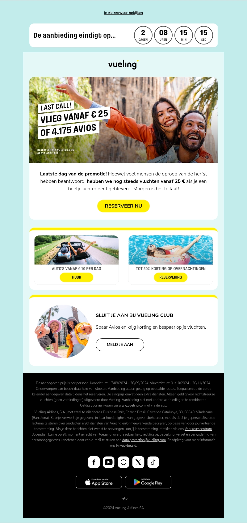 Het is de laatste dag van de promotie bij Vueling! Boek nu je vlucht vanaf slechts € 25 of 4.175 Avios. Mis de kans niet om goedkoop te vliegen en meer te besparen op autoverhuur en hotelreserveringen.
