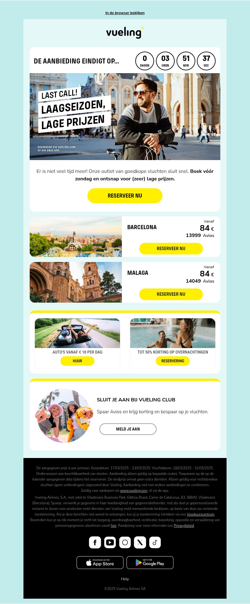 Onze outlet van goedkope vluchten sluit binnenkort! Boek nog voor zondag en profiteer van enorme kortingen naar geweldige bestemmingen zoals Barcelona en Malaga. Vergeet niet ook onze autoverhuurdeals vanaf β¬10 per dag en hotelkortingen tot 50% te bekijken. Sluit je aan bij de Vueling Club en spaar Avios voor nog meer voordeel. Mis deze kans niet!