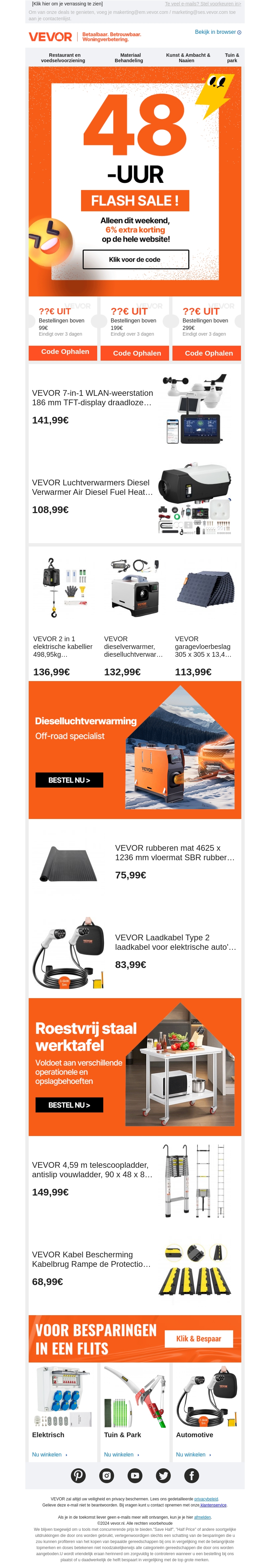 Mis de kans niet om dit weekend te profiteren van onze 48-uur flash sale bij VEVOR. Ontvang 6% extra korting op uw aankopen wereldwijd. Verken geweldige deals op gadgets, transportbenodigdheden en keukengerei. Bezoek onze website en bekijk het brede assortiment. Vergeet niet om snel te handelen, want de tijd tikt!