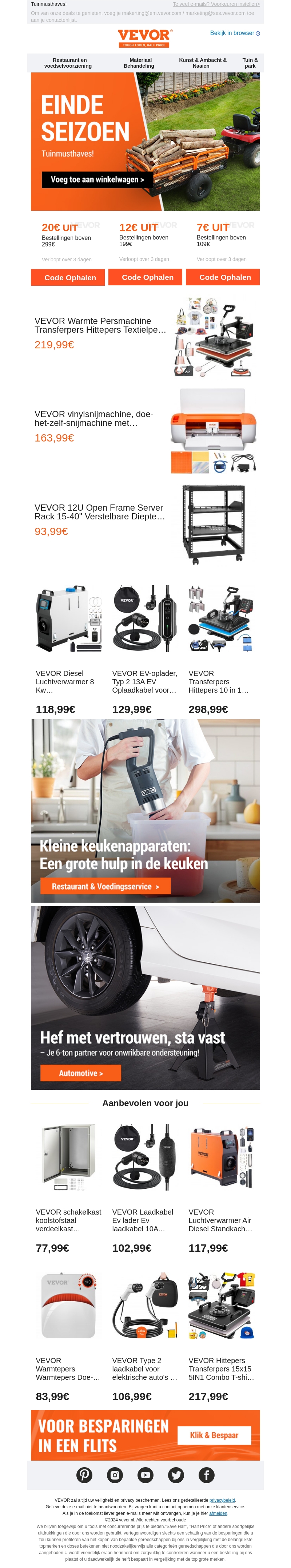 Mis de Woensdagspecials bij VEVOR niet! Profiteer van geweldige kortingen tot wel âŦ20 op geselecteerde items. Ontdek tuin en parkuitrusting, keukenapparatuur en meer. Voeg producten eenvoudig toe aan je winkelwagen en haal je korting op. Grijp nu je kans om te besparen!