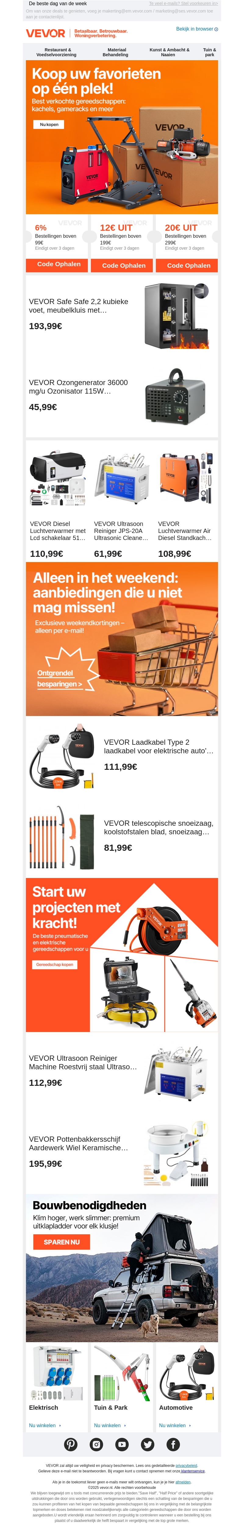 Beleef de spanning van VEVOR’s weekendmysteriekorting en ontdek fantastische deals op topgereedschappen. Van gereedschapswagens tot luchtverwarmers, er is voor ieder project iets te vinden. Haal snel je kortingscode en bespaar op je favoriete producten. Mis deze exclusieve kans niet om je gereedschapscollectie uit te breiden. Bereid je voor op het weekend en begin met krachtige nieuwe tools. Ontgrendel nu jouw unieke besparingen.