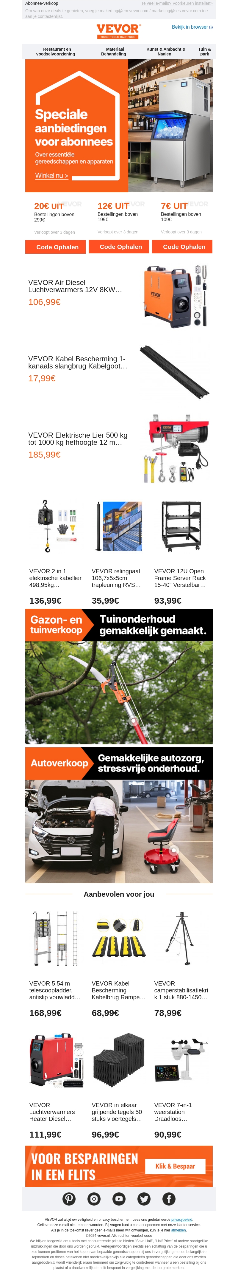 Mis deze exclusieve deals niet! Ontdek speciale aanbiedingen voor VEVOR-abonnees op gereedschappen en apparatuur. Krijg extra kortingen op uw volgende bestelling. Profiteer van tot 20€ korting op geselecteerde aankopen. Deze deals zijn geldig voor een beperkte tijd. Haal uw code op en bespaar direct.