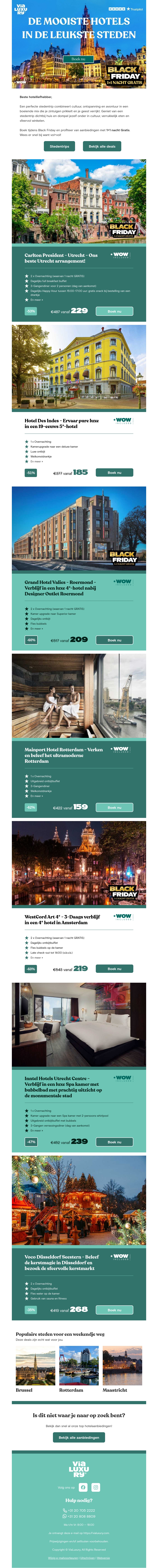 Verken de mooiste steden met onze exclusieve hoteldeals! Van historische steden tot bruisende metropolen, deze stedentrips bieden een unieke ervaring. Ontvang speciale aanbiedingen inclusief kortingen voor Black Friday. Boek nu een onvergetelijk verblijf in uw favoriete stad. Grijp de kans om luxe accommodaties te ontdekken en te genieten van alles wat de stad te bieden heeft.