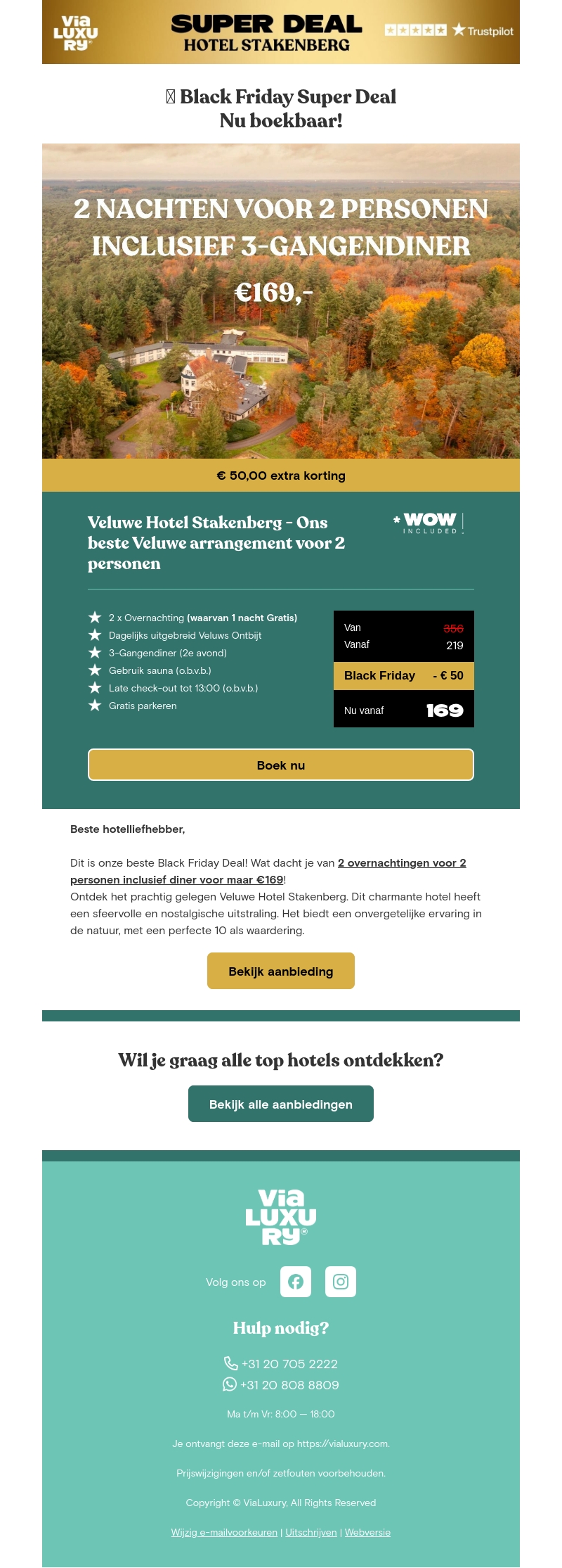 Ontdek de beste Black Friday deal bij Hotel Stakenberg in de Veluwe. Geniet van 2 overnachtingen voor 2 personen inclusief een 3-gangendiner voor slechts €169. Beleef een unieke ervaring in de natuur met gratis ontbijt, sauna en laat uitchecken. Een perfecte waardering van 10 maakt dit de ideale ontsnapping.