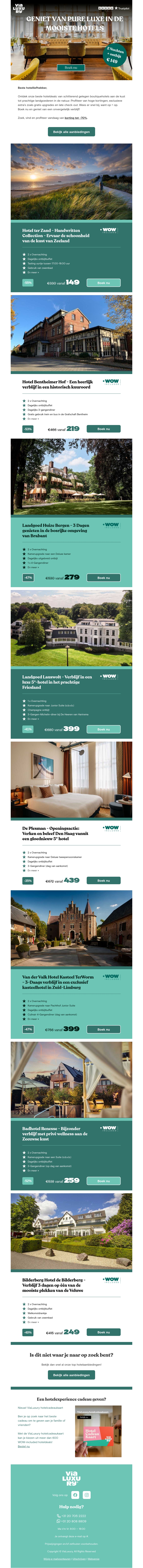 Verwen jezelf met een ontspannend verblijf in prachtige hotels. Geniet van twee nachten voor twee personen, inclusief ontbijt, voor een voordelige prijs van €149. Dit exclusieve aanbod biedt u de kans om te ontspannen in een luxe omgeving. Maak van de gelegenheid gebruik om de mooiste plekken te ontdekken. Boek snel voordat het aanbod afloopt!