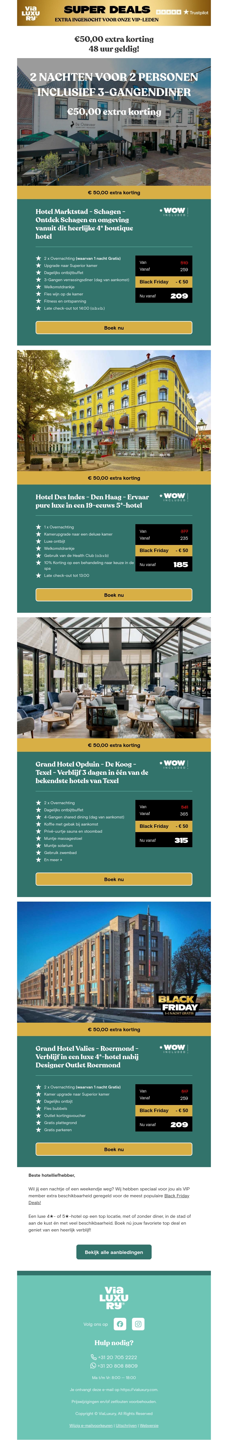 Ontdek nu onze exclusieve VIP-aanbieding met €50 korting, geldig voor slechts 48 uur! Verblijf in luxe hotels met onvergetelijke ervaringen. Boek nu jouw droomvakantie en profiteer van deze buitengewone Black Friday deals.