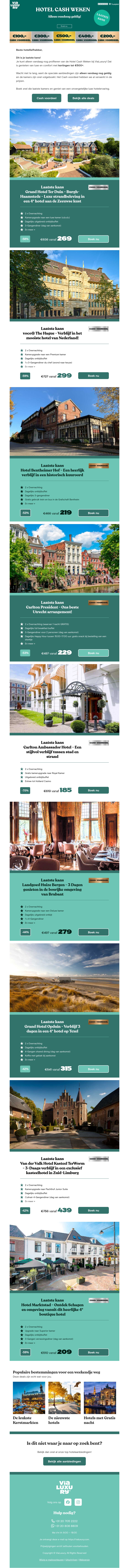 Ervaar luxe en bespaar tijdens de Hotel Cash weken met kortingen tot €500+. Alleen vandaag profiteert u van exclusieve aanbiedingen bij diverse hotels. Ontdek prachtige bestemmingen en geniet van een ontspannende vakantie. Boek nu en verzeker uzelf van het beste aanbod. Mis deze eenmalige kans niet. Klik snel voor meer informatie.