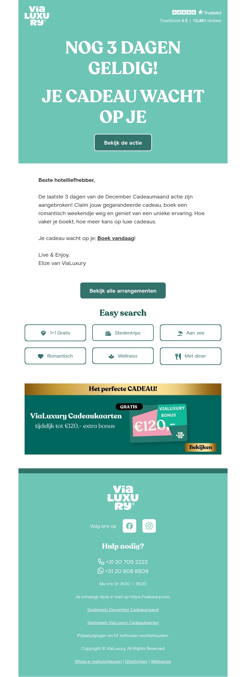 Nog maar 3 dagen om jouw gegarandeerde cadeau te claimen bij ViaLuxury. Boek een romantisch weekendje weg en geniet van een unieke ervaring. Hoe vaker je boekt, hoe meer luxe cadeaus je kunt ontvangen. Dit is de perfecte gelegenheid om jezelf te verwennen of iemand anders blij te maken. Ontdek nu alle arrangementen die bij jou passen. Profiteer van tijdelijk extra bonussen tot β¬120.