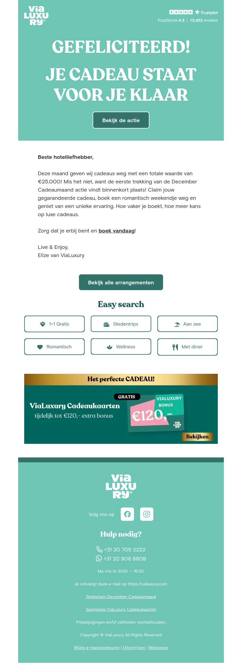ViaLuxury nodigt je uit voor de spannende December Cadeaumaand! Met een cadeaupot van β¬25.000 zijn er geweldige prijzen te winnen. Boek een romantisch weekendje weg of geniet van andere luxe arrangementen. Hoe vaker je boekt, hoe meer kans je hebt om een cadeau te winnen. Ontvang tijdelijk tot β¬120 extra bonus met onze cadeaukaarten. Zorg ervoor dat je erbij bent!