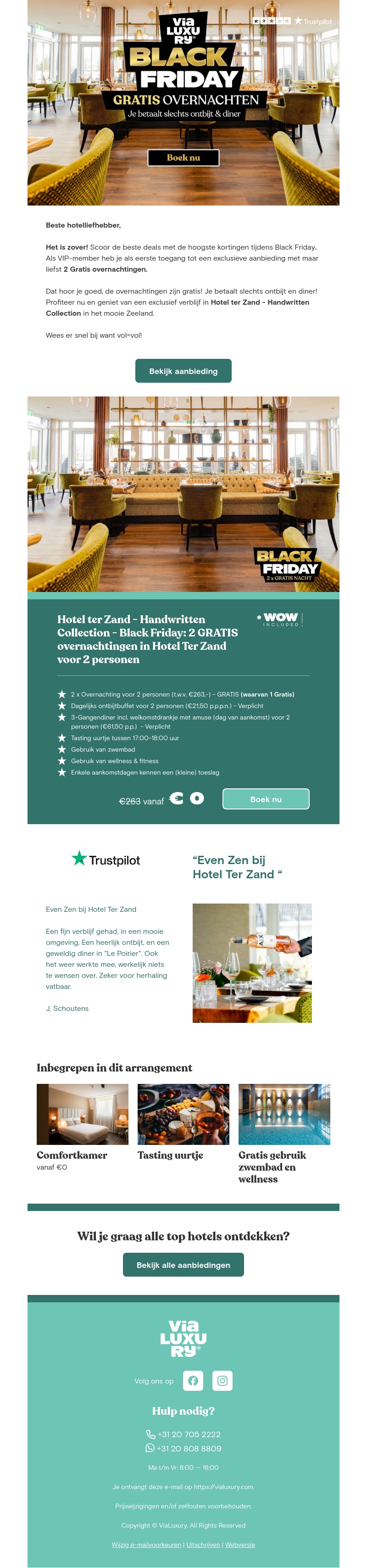 Ontdek de beste Black Friday deals met 2 gratis overnachtingen in een top hotel. Geniet van luxe accommodaties, inclusief ontbijt en diner, alleen bij ViaLuxury. Boek nu deze exclusieve aanbieding voor een onvergetelijke ervaring. Wees er snel bij, want vol = vol!