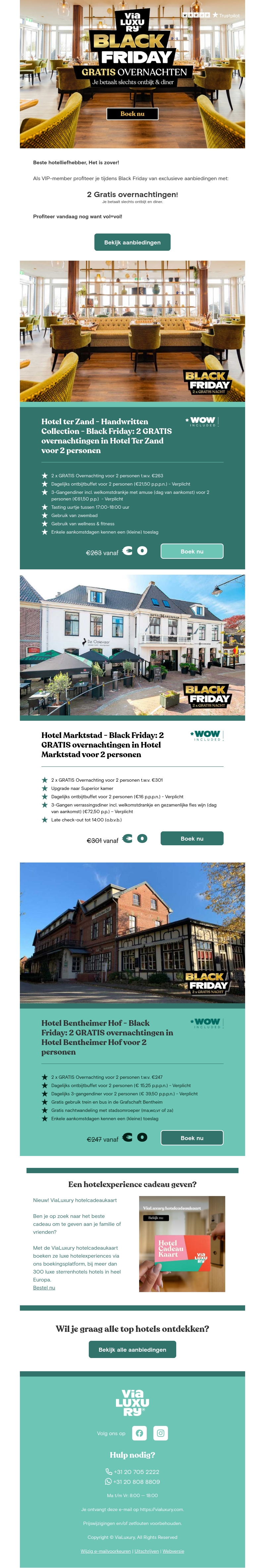 Beleef luxe overnachtingen met Via Luxery during Black Friday! Ontvang twee gratis hotelnachten bij selectieve boekingen. Profiteer van deze exclusieve aanbiedingen in top hotels voor een onvergetelijke ervaring. Boek nu en geniet van luxe zonder de kosten. Ontdek onze bijzondere hoteldeals en ervaar luxe verblijven. Mis deze unieke kans niet!