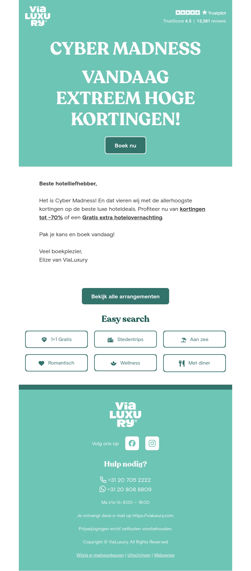 Ontdek Cyber Madness met ViaLuxury! Geniet van kortingen tot 70% op exclusieve hotelarrangementen, inclusief gratis extra nachten. Kies uit stedentrips, wellnessopties en meer. Boek vandaag nog en profiteer van deze geweldige aanbiedingen.
