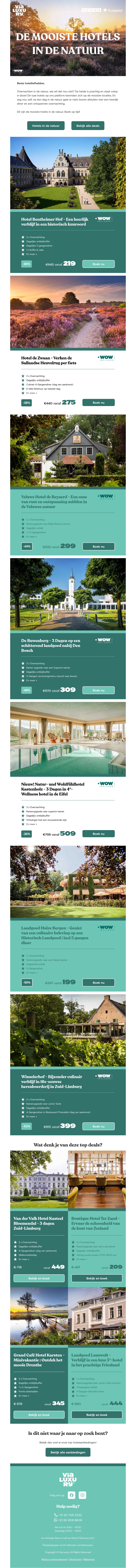 Ontdek de mooiste hotels in de natuur en geniet van een ontspannen verblijf midden in de mooiste landschappen. Van luxe landhuizen tot knusse boetiekhotels, deze selectie biedt voor ieder wat wils. Boek snel je verblijf en beleef de natuur zoals nooit tevoren.