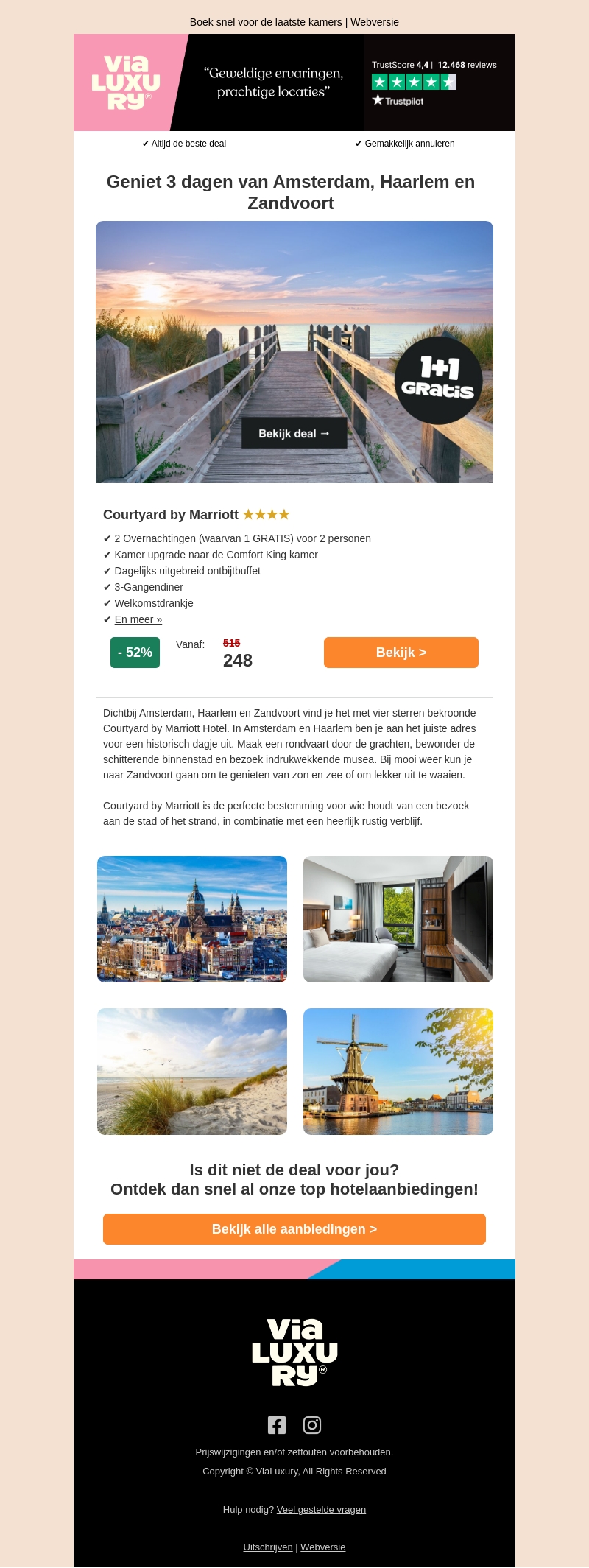 Ontdek de topbestemming van deze week en geniet van een 3-daagse vakantie in Amsterdam, Haarlem en Zandvoort. Verblijf in het Courtyard by Marriott met luxe voorzieningen en aantrekkelijke kortingen. Inclusief dagelijks ontbijt, upgrade naar een Comfort King kamer, en een welkomstdrankje.