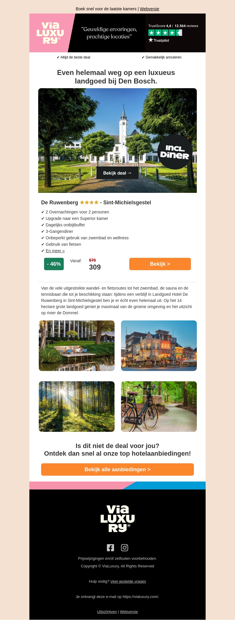 Ben je toe aan een luxe ontsnapping? Boek dan nu een verblijf op het prachtige landgoed De Ruwenberg in Sint-Michielsgestel. Inclusief 2 overnachtingen voor 2 personen, upgrade naar een Superior kamer, dagelijks ontbijt en diner, en onbeperkt gebruik van zwembad en wellness. Geniet ook van prachtige wandel- en fietsroutes. Allemaal voor een gereduceerde prijs van €309!