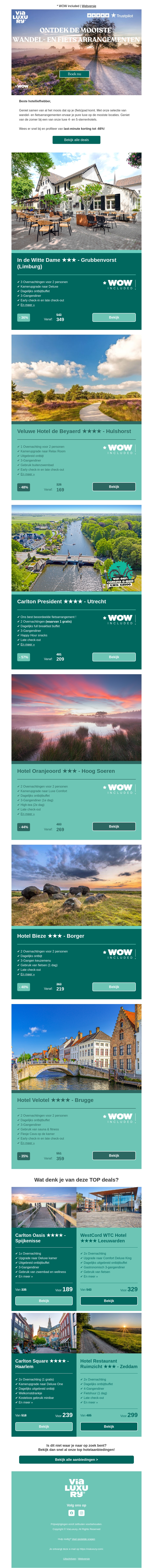 Geniet van de mooiste wandel- en fietsarrangementen in Nederland en België. Verblijf in prachtige hotels en ervaar de rust en schoonheid van de natuur. Boek nu en ontvang tot 48% korting op geselecteerde arrangementen.