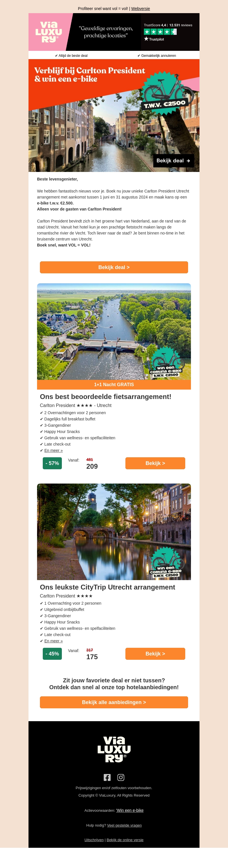 We hebben fantastisch nieuws voor je! Boek nu jouw unieke Carlton President Utrecht arrangement en maak kans op een e-bike t.w.v. €2500. Geniet van een verblijf in het groene hart van Nederland met prachtige fiets- en wandelroutes. Profiteer van exclusieve kortingen en extra's voor een onvergetelijke ervaring.