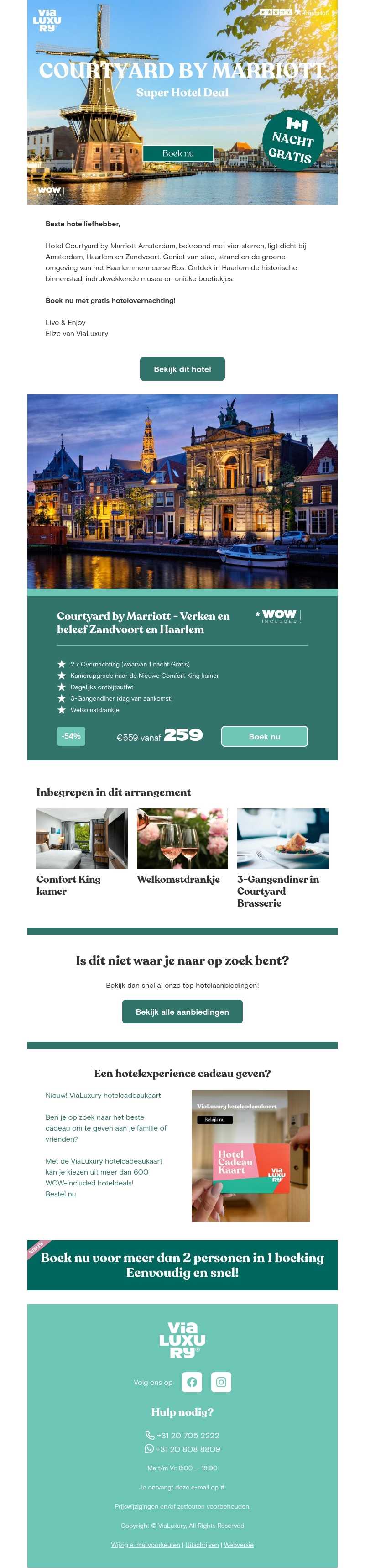 Ontsnap naar het Courtyard by Marriott Amsterdam voor een onvergetelijk verblijf. Geniet van een gratis nacht, luxe kamers en een heerlijk driegangendiner. Ontdek de charme van Haarlem en de nabijgelegen steden. Deze aanbieding omvat ook een welkomstdrankje en dagelijks ontbijtbuffet.