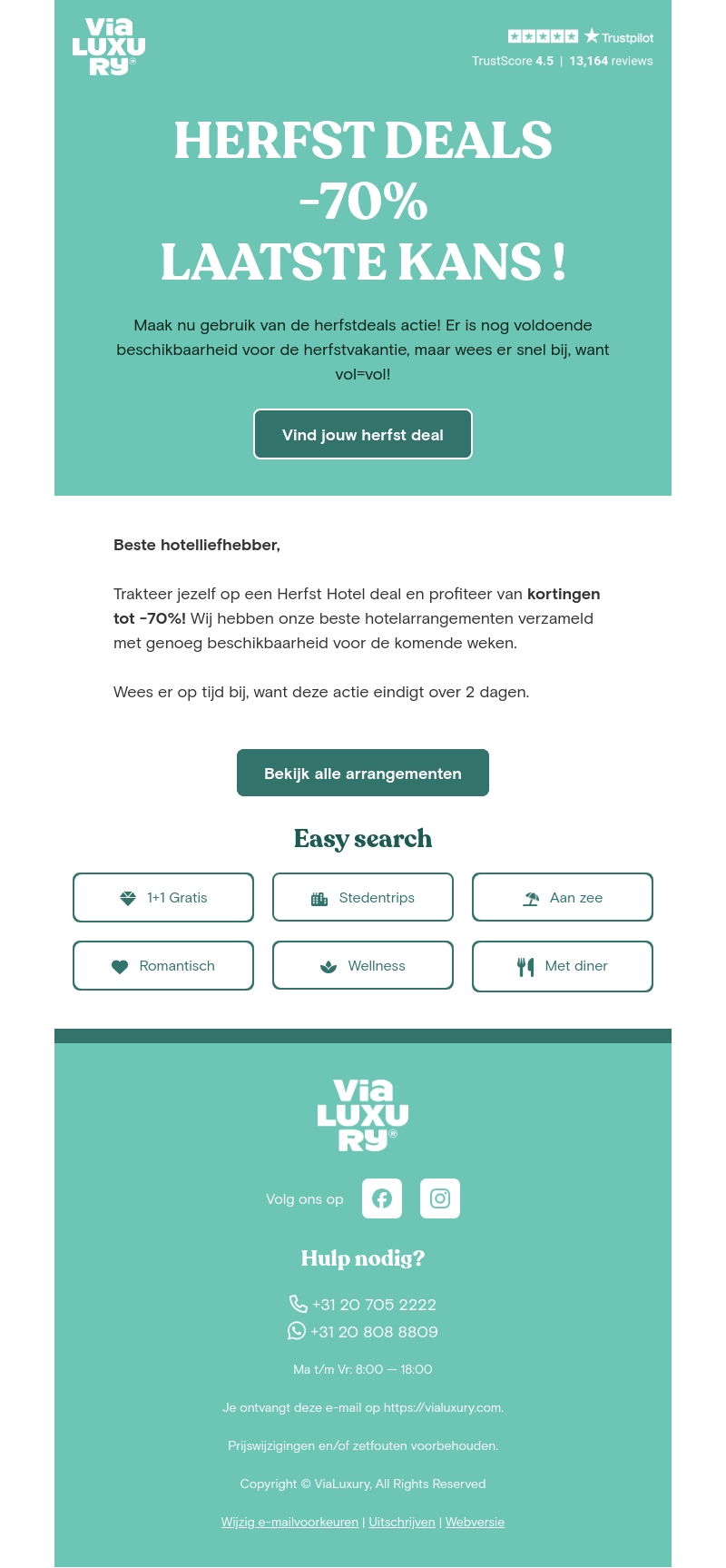 Grijp nu je kans op de beste herfstdeals met kortingen tot maar liefst 70%! ViaLuxury biedt een geweldige selectie hotelarrangementen aan met voldoende beschikbaarheid. Let op: de actie loopt over 2 dagen af. Ontdek arrangementen zoals 1+1 Gratis, stedenreizen, en wellness opties.