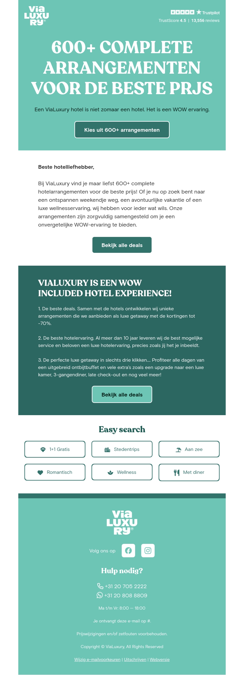 Ervaar het ultieme in luxe hotelaanbiedingen bij ViaLuxury. Kies uit meer dan 600 complete arrangementen voor de beste prijs. Of je nu op zoek bent naar ontspanning of avontuur, bij ons vind je de perfecte deal. Ontdek unieke wellnesservaringen en luxe vakanties, zorgvuldig samengesteld om je een onvergetelijke WOW-beleving te bieden. Boek nu en geniet van aantrekkelijke kortingen.